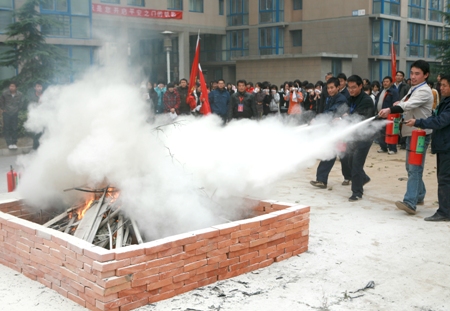 疏散演習結束后,滅火演練開始,3號樓南側燃燒著兩堆雄雄大火,來自后勤管理處公寓中心、物業中心、餐飲中心工作人員,學生治安隊同學,化工學院、材料系、繼續教育學院、研究生部學生代表,在校施工單位人員,駐校外單位代表紛紛用滅火器進行了滅火演練,最后,由保安和宿舍管理人員組成的兩支義務消防隊,分別用水槍進行了滅火演練。