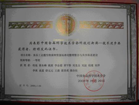 此外,我校參加的該項目獲得了中國食品科學技術學會科技創新獎—技術進步獎一等獎,課題負責人陳存社博士獲得獎勵證書。