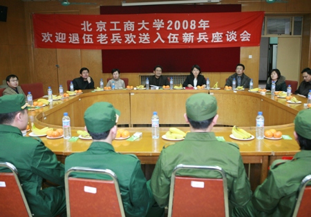 12月9日下午,學(xué)校歡送應(yīng)征入伍大學(xué)生座談會(huì)在阜成路校區(qū)二樓會(huì)議室舉行。今年我校被批準(zhǔn)入伍的8名在校大學(xué)生、剛剛退伍回校的2006年入伍的大學(xué)生參加了座談會(huì)。學(xué)校黨委副書(shū)記兼紀(jì)委書(shū)記張德玉,學(xué)生處、武裝部以及相關(guān)學(xué)院黨總支副書(shū)記出席了座談會(huì)。學(xué)生處處長(zhǎng)兼武裝部長(zhǎng)呂素香主持會(huì)議。