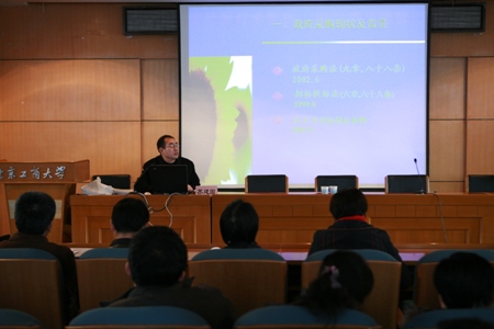 講座中,蘇建國副教授圍繞政府采購的相關法規、政策,結合設備技術參數論證和評審的實際案例,為與會者做了深入淺出地詳細講解。中國電子進出口總公司項目經理張昕昕就招標代理機構在政府采購活動中執行政府采購法、履行招標程序等方面做了講解。期間,兩位主講人還與在座老師進行了友好互動,解答了教師們所提出的問題。