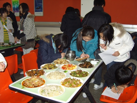 這次調研的菜品都是平時食堂最常見到的家常菜,食堂負責人詳細介紹了菜名、價格及主要用料。同學們認真閱讀評分細則,對10道主菜和2道點心進行了品嘗,從口感、色澤、味道、品質、營養價值等方面進行評分,最后評出了最具人氣獎、最佳風味獎、最佳主食獎、最佳副食獎、物美價廉獎5個獎項。