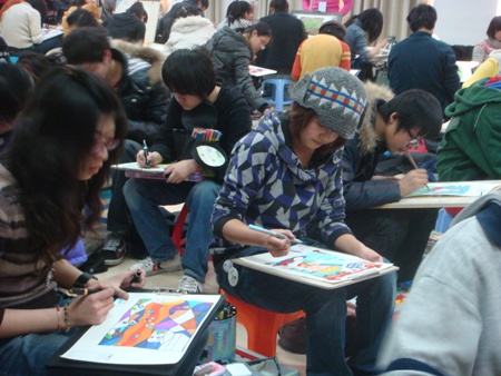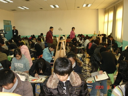 據觀察,大多數考生都有家長陪同。無論是咨詢還是報名,家長都是奮不顧身,沖在前頭,儼然是考生的“經紀人”。孩子在考試,家長在心焦。從上午8點半到下午4點半,素描(含速寫)、色彩考試分別進行,由于考生太多、考試時間較長,加上冬寒未散,家長非常辛苦。一位家長說,他的孩子感冒了,考完要帶他去打點滴,否則會影響參加另一所學校組織專業考試。