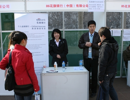 花旗銀行人力資源部門對此次雙選會充分重視,派出了強大的陣容。由北方區人力資源部經理帶隊、由8名資深部門主管參加的面試隊伍稱得上本次雙選會之最。為提高效率,第一時間獲得準確求職者信息,他們在雙選會主會場之外,在耕耘樓招聘室開辟了分會場,現場對求職者進行分組面試考核。在現場主持招聘的劉芬經理表示,花旗銀行曾經錄用過北京工商大學的畢業生,這些員工表現都很優秀,正是基于此,本次招聘活動得到了上級的高度重視,決定在我校重點招聘英才,因此才提出了“分會場”的方案。