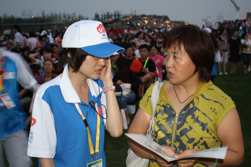 音樂會晚上7:30正式開始。上午9點,志愿者們便到達現場,分工完畢后,立即投入工作中。第一項任務是裝禮品包。志愿者們要在有限的時間內裝完5000份禮包,任務艱巨。大家20幾個人一組,采取了“流水線”的工作方法,裝東西的同學不停地將禮品裝入袋子,充當“傳送帶”的同學更辛苦,繞著一堆堆禮品轉到頭暈眼花……悶熱的天氣、艱巨的任務讓他們汗流浹背,盡管如此,隊伍中時常爆發出陣陣爽朗的笑聲。他們開著各種玩笑,輪流著替換工作來減輕疲憊。志愿者們的智慧和樂觀、積極、向上的精神狀態感動了在場的其他工作人員們。