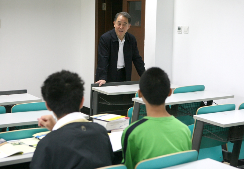 經過的第一間教室里在上英語課,老師講得投入,學生聽得認真。在另一間教室,見里面有四個學生在看書,孫堯東同志進去與他們交談。交談中得知,這四個男生是商學院09級的新生,因為課程安排在后兩節,他們先在這里自習。孫堯東同志詢問新生們對學校的感覺,以及課余時間如何安排。