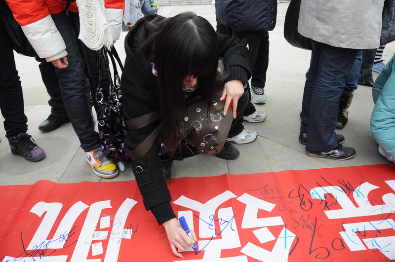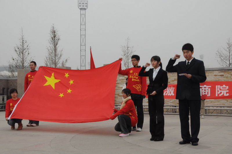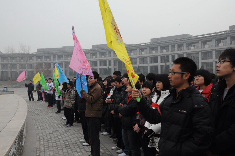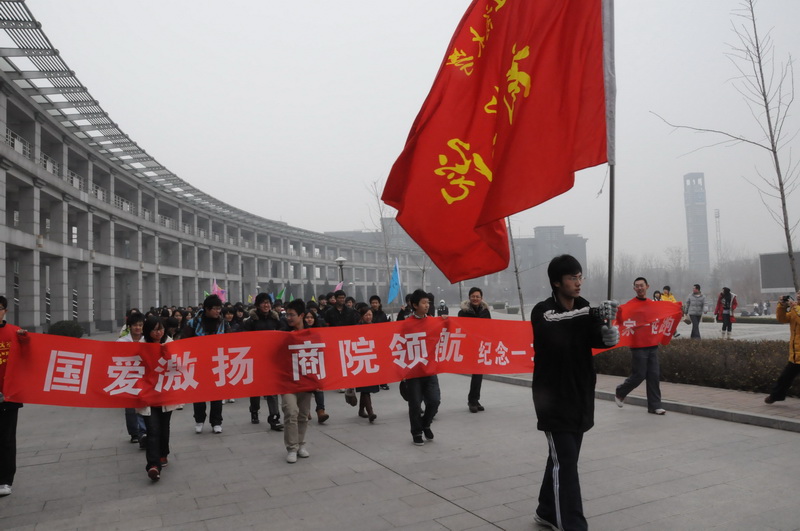 在商院火紅旗幟的帶領下,大一年級十五個班級的同學從下沉廣場出發,沿著學校教學區的主干道慢跑起來。整齊的行進隊伍中不時爆發出嘹亮的愛國口號。天氣雖然格外寒冷,但同學們的情緒卻異常高漲。