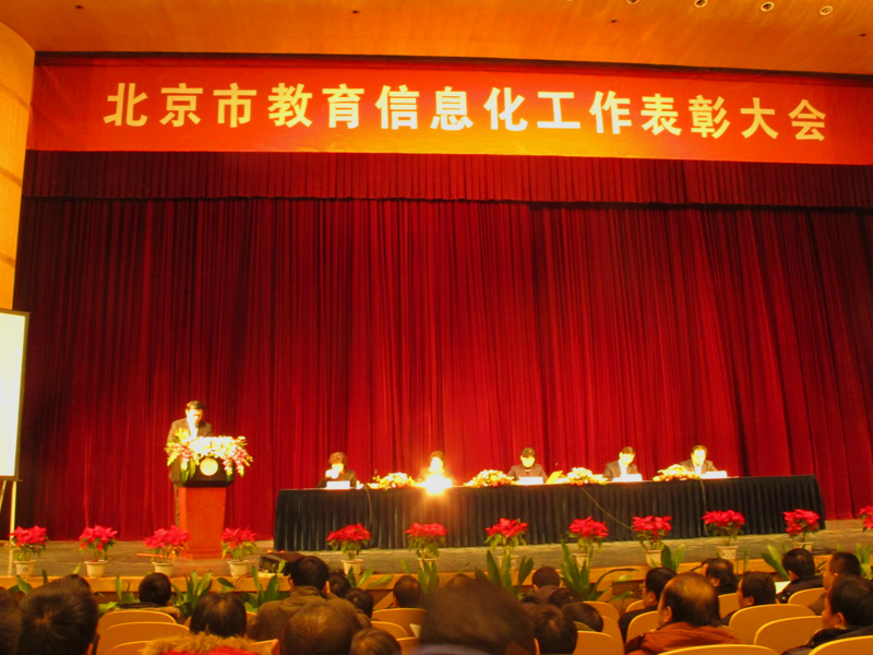 本次大會是北京市關于教育信息化方面的第一次如此大規模的總結表彰大會,受表彰的單位有市教委直屬單位、普通高等學校、職業成人學校、教委所屬教育教學單位。出席大會的有北京市經濟和信息委員會副主任姜毅群、教育部科技司副司長陳盈輝、北京市教委副主任郭廣生、北京市教委委員曹素云;北京市高校信息化主管校長、信息中心主任;區縣主管主任、信息中心主任;各直屬單位領導;獲獎單位代表及獲獎個人。在表彰大會上北京市教委郭廣生副主任對獲獎單位和個人表示祝賀,并做了“站在新的歷史起點上,推動北京教育信息化發展”的主題報告,對北京地區高校九年來教育信息化工作取的成績給予了充分肯定,對下一步工作提出了新的任務。教育部陳盈輝副司長祝賀北京市教育信息化取得的成績,贊揚北京教育信息化走在了全國前列,希望高校大力推進數字校園建設,充分利用現有資源為首都和全國服務,做出更大貢獻。北京市經濟與信息化委員會姜毅群副主任介紹了北京市整個信息化發展情況,對高校信息化工作提出了四點思考:1.高標準籌化教育信息化規劃和任務;2.提升教育信息化面向社會服務的功能;3.加強優質教學資源的整合,服務于學習型社會的創新;4.加強信息網絡的安全保障。會議希望受表彰的單位和個人再接再厲,不斷創新,積累更多更好的經驗,取得更大的成績。希望廣大教育工作者要不斷學習、借鑒先進經驗,加快本市教育信息化建設與應用步伐,使北京教育信息化建設與應用水平邁上新臺階。