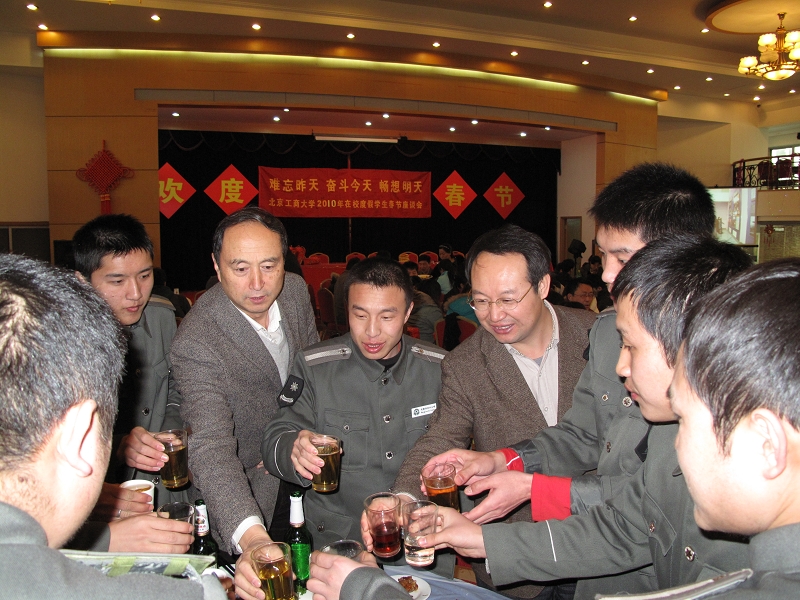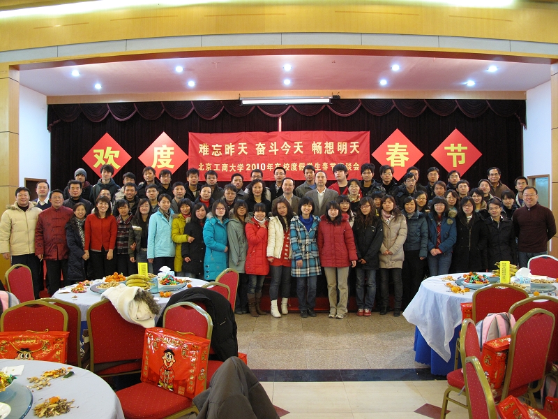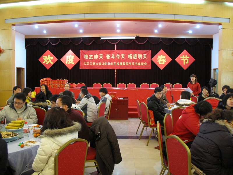 2月13日,農歷“除夕”。10時,阜成路東校區學生餐廳張燈結彩、喜氣洋洋,由學生處主辦的“難忘昨天、奮斗今天、暢想明天”2010年寒假留校學生春節座談會及節日午宴在一派節日氣氛中隆重舉行。學校黨委副書記盧思鋒、副校長呼文亮及有關院系、職能部門負責同志與寒假留校的學生歡聚一堂,共賀新春。