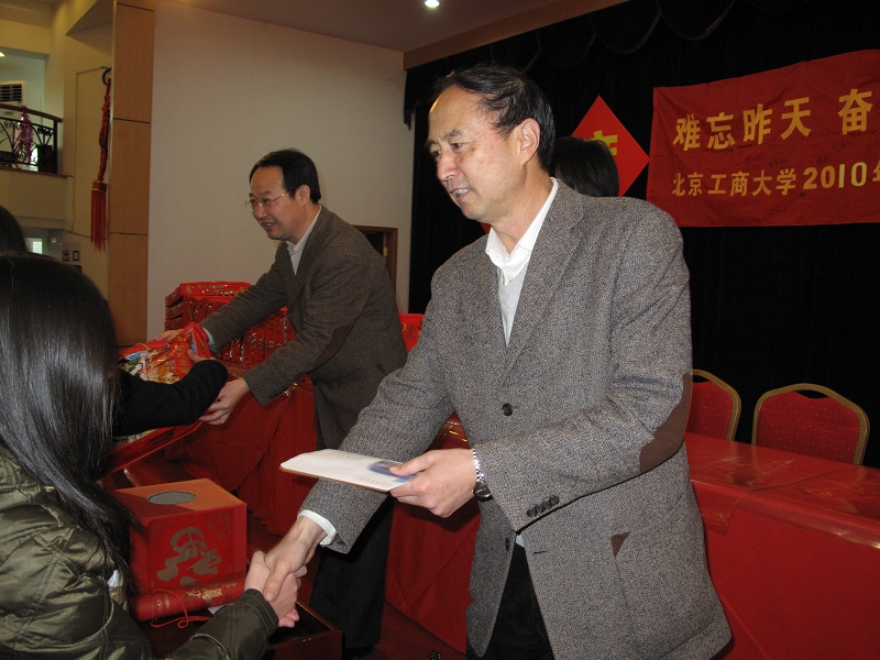 在歌唱祖國的樂曲聲中,盧思鋒、呼文亮向留校學生贈送了節日禮品、慰問金、餐券和電話卡。學校辦公室主任吉濤、商學院黨總支書記龐毅、傳媒學院黨總支書記秦巍、外語學院黨總支書記閆冀生、保衛處處長頓勁松、宣傳部副部長袁小年、團委書記呂良、后勤處副處長尹寶星等同志分別為同學們抽取發放了新年賀卡和由團市委提供的錦囊禮包。