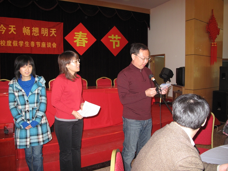會議由學生處處長呂素香主持,學生處副處長徐紅京、經濟學院黨總支副書記馬韜光、機械學院黨總支副書記田宏、材料系黨總支副書記馬春暉參加了座談會。在節日午宴期間播放了學生處特別制作的假期留校學生活動視頻《共享親情、共建和諧》。