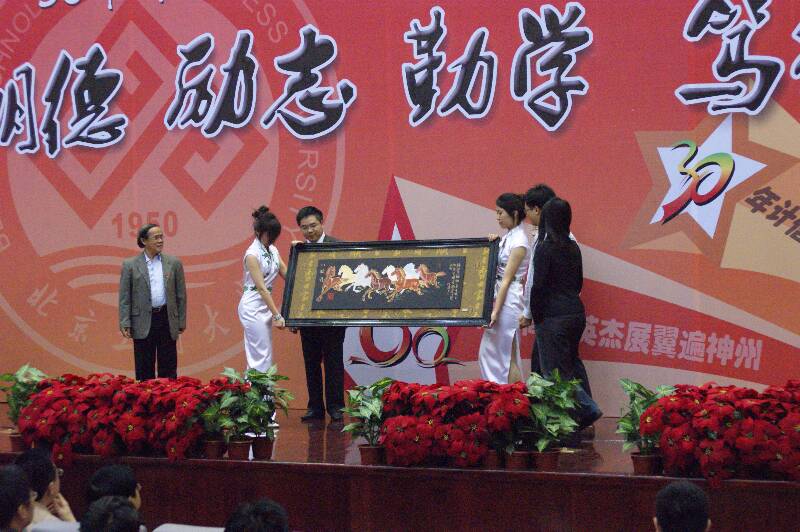 校友胡萬海(航天科工集團第三研究院總工)、徐嘉偉(中國惠普有限公司部門經理)、林水源(北京微眾教育有限公司總經理)分別代表80年代、90年代和2000年代的校友依次發言。他們回想起當年在校園里的美好年華,感慨萬千。校友胡萬海說到:“北京工商大學雖沒有北大的高傲,清華的厚重,但北工商是我們人生中最大的財富,我們曾化身桃李,吸吮母校這棵大樹的智慧精華,北工商是我們成長的圣地、進步的源泉!”同時,校友們以自己的親身經歷告訴同學們,在四年的大學生活中,應該不斷的進步,思考為什么學習,學習些什么,怎樣去學習,充實自己的大學生活,希望同學們在計信學院這個大平臺上鍛煉自己,創造更大的輝煌!之后,信管96級的何長松、信管98級的呂燕代表廣大校友向學院贈送了一幅《八駿圖》,意寓學院各項事業一馬當先、萬馬奔騰、勇往直前!