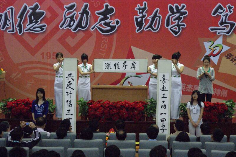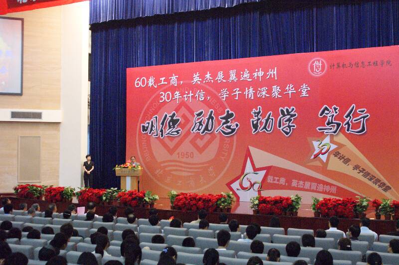 慶典大會在雄壯的國歌聲中拉開序幕。嘉賓和師生們觀看了學校、學院歷史發展變遷的視頻短片。短片展示了北京工商大學從60年前建校伊始發展到現在的風雨歷程,也展示了學院30年中所創造的輝煌成就。院長劉載文為慶典致辭,他介紹了計算機與信息工程學院成立以來的發展與成就,同時勉勵學院同學努力學習,為學院的未來增光添彩。隨后,五位退休老教授登臺發言。他們在感慨學院蒸蒸日上的同時,也告誡同學們抓緊時間勤奮學習,為工作和事業奠定良好的基礎。