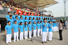 8點(diǎn)整,隨著大會(huì)主持人張德玉副書記宣布大會(huì)開始,雄壯的音樂聲響起,國(guó)旗班的衛(wèi)士們擎著鮮艷的五星紅旗正步走來。隨后,身穿白色練功服的教職工代表隊(duì)邁著自信的步伐走過主席臺(tái),頻頻向觀眾揮手致意,激起一片掌聲。在他們之后,精神抖擻的運(yùn)動(dòng)健兒與表演方陣邁著整齊的步伐通過主席臺(tái),并奉獻(xiàn)了一場(chǎng)場(chǎng)精彩的一分鐘演出:商院的武術(shù)表演剛?cè)嵯酀?jì)、法學(xué)院的華爾茲優(yōu)雅迷人,機(jī)械學(xué)院的旗語表演齊整有力,藝術(shù)與傳媒學(xué)院的校慶拼圖別出新意,每段表演都精彩萬分。