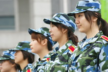 不同的軍裝同樣的士氣。當“女兵”們喊著響亮的口號、踏著整齊的正步行進時,“男兵”們都聽到了教官的提醒:你們怎么可以讓女生比下去呢!于是,操場上的口號聲此起彼伏,一浪高過一浪。