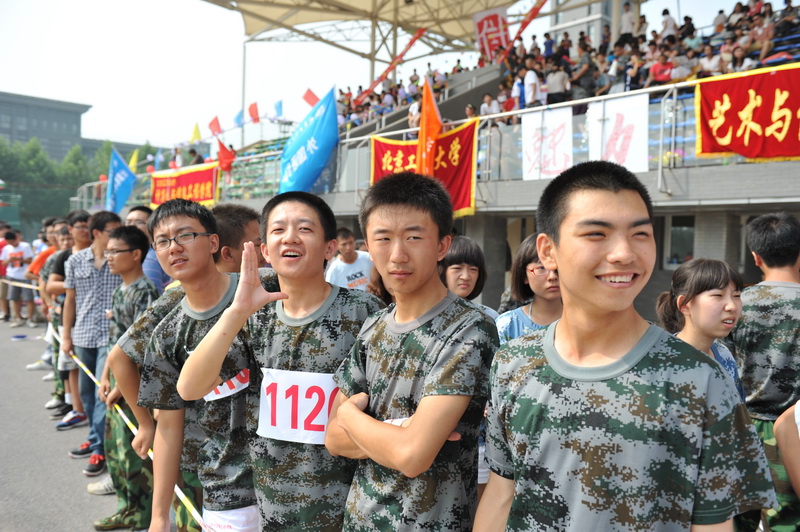 首先進行的是男子100米的預賽。參賽運動員有的身著休閑T恤,有的穿上專業的徑賽服裝,但是由于這次運動會正值軍訓期間,賽場上還多出了一抹靚麗的綠——迷彩軍裝。