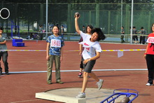 助跑!彎腿!蓄力!起跳!前沖!在男子跳遠預決賽現場,參賽隊員的激情和活力展示著工商學子積極向上的風采。只見一個身著迷彩短袖的男生以百米沖刺的速度助跑,起跳線前騰空一躍,連胳膊上纏繞著的紫色絲帶都跟著跳動起來。騰空的身影,青春的迷彩,紫色的絲帶,連腳下金黃的沙坑都跟著躍動起來。