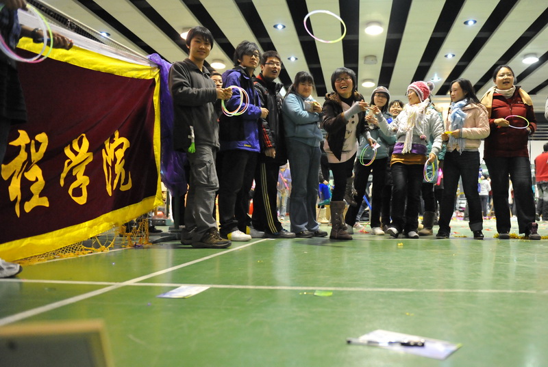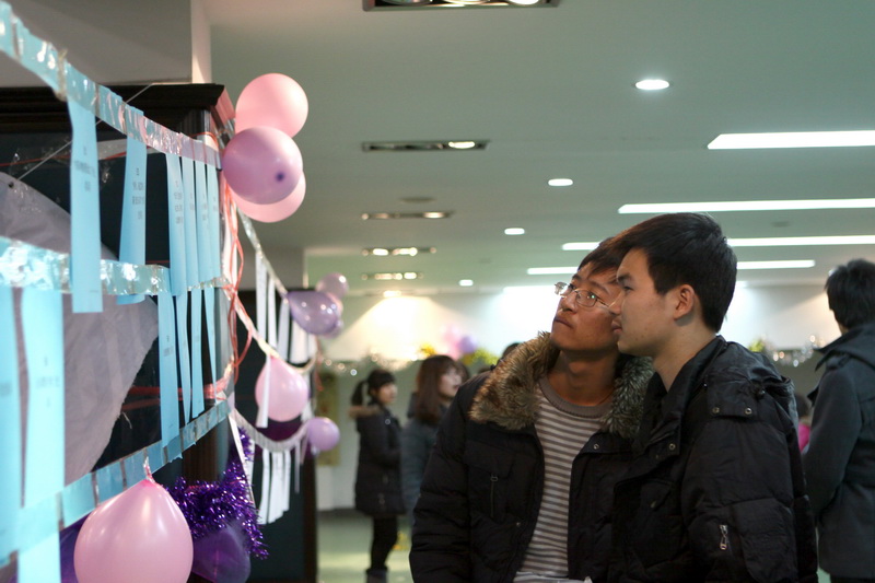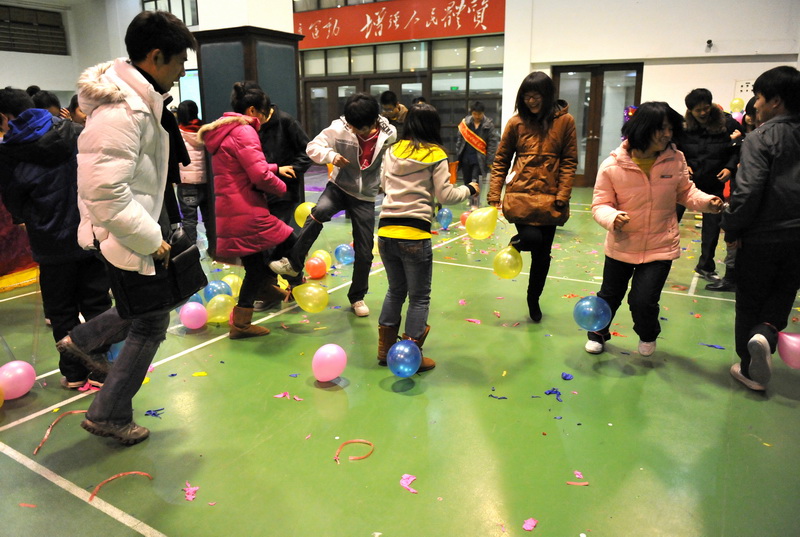 只見(jiàn)三對(duì)同學(xué)背靠著背夾著一只氣球,奮力向終點(diǎn)——椅子,發(fā)起沖擊,最先到達(dá)的人把氣球放到椅子上,接著奮力一坐,只聽“啪!”一聲,比賽的冠軍誕生了!這就是機(jī)械工程學(xué)院在今年游藝會(huì)上的重頭游戲。據(jù)游戲負(fù)責(zé)人介紹,機(jī)械學(xué)院這次還準(zhǔn)備了“蹲蹲樂(lè)”和“五毛和一塊”活動(dòng)。