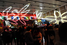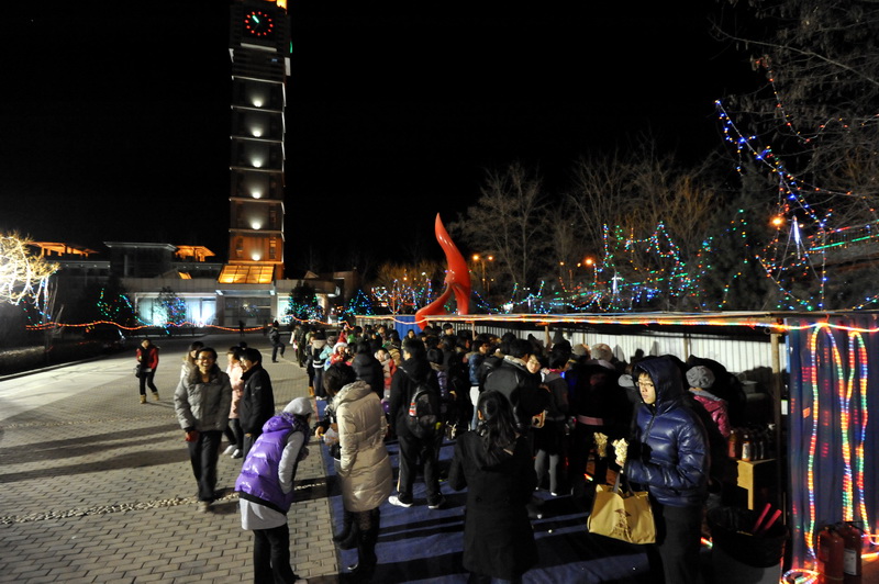 在文體館外,搭建起了大約10米長(zhǎng)的臨時(shí)小屋。小屋四周流光溢彩,洋溢著節(jié)日的喜悅;屋外的藍(lán)布式地毯上密密集集地?cái)D滿了學(xué)生;食物的香氣和熱氣混合著同學(xué)們的笑聲充溢著北工商的元旦之夜。