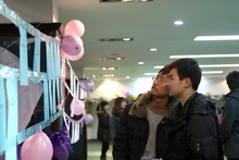 從藝術(shù)與傳媒學(xué)院活動(dòng)場(chǎng)地走出了幾位“亮”女,她們或是腮邊、或是眼角、或是眉間、或是手背都有一抹閃亮的色彩。原來(lái)那抹色彩是她們游戲獲得的獎(jiǎng)品——“人體彩繪”。還有一位短發(fā)的女生正端坐著面對(duì)一位手拿畫板的男生。這位女生剛剛將乒乓球擲進(jìn)了由飲料品擺成的心形的正中心。而她的獎(jiǎng)品,正是這位男生現(xiàn)場(chǎng)為她手繪的臉部速寫。
