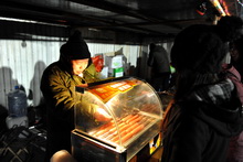 這是北京工商大學(xué)首次開設(shè)小吃街,學(xué)校領(lǐng)導(dǎo)和相關(guān)工作人員為此做了長(zhǎng)期而精心的準(zhǔn)備。在食物選材方面,學(xué)校考慮到天冷,怕同學(xué)們吃壞了肚子,因此準(zhǔn)備的東西大都是熱食。麻辣燙,烤番薯,羊肉串,烤腸,冷熱飲,爆米花,糖葫蘆都是今晚推出的主要食品。其中,糖葫蘆最受歡迎,晚會(huì)還沒(méi)完就賣完了。“這次小吃街很成功,我很喜歡。希望明年還能繼續(xù)有小吃街,如果花樣再多點(diǎn),價(jià)格再便宜一點(diǎn)那就更好了”一位同學(xué)邊吃著烤番薯邊對(duì)記者說(shuō)。