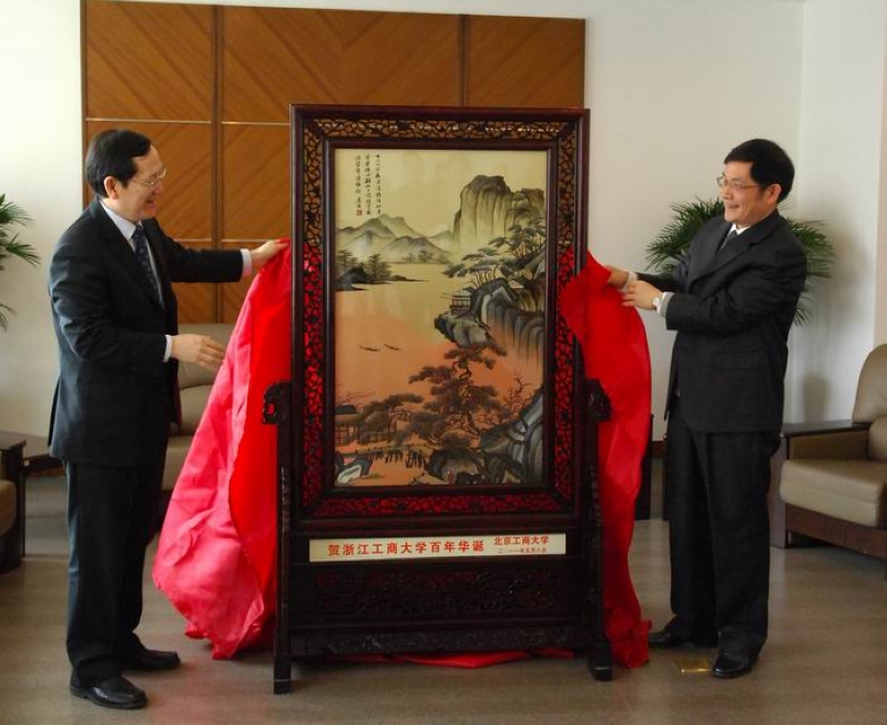 2011年適逢浙江工商大學(xué)建校100周年,譚校長(zhǎng)代表北京工商大學(xué)全校師生員工向浙江工商大學(xué)百年校慶捐贈(zèng)屏風(fēng)一樽,并預(yù)祝百年校慶各項(xiàng)活動(dòng)圓滿成功。佇立錢塘江畔,耳邊潮水湯湯,兩校領(lǐng)導(dǎo)同勉要繼承兄弟高校情誼,在實(shí)施科教興國(guó)和人才強(qiáng)國(guó)戰(zhàn)略中,勇立改革創(chuàng)新、特色名校、加快轉(zhuǎn)型、科學(xué)發(fā)展的歷史潮頭。