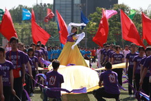 作為衛(wèi)冕冠軍,計信學(xué)院這次志在三連霸。在表演的一開始,看臺上就喊出了“計信健兒勇奪魁”的口號,紅色的腰鼓,紫色的方陣,《黃種人》震撼的伴奏音樂……計信學(xué)院這次真是霸氣外露,王者氣息十足。