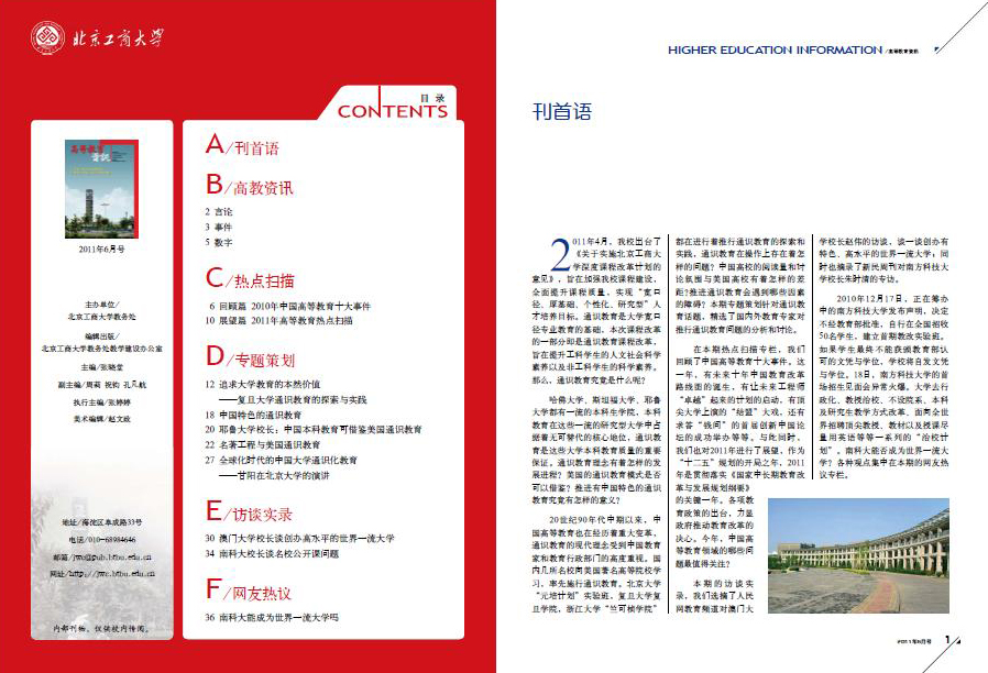 該刊物創刊號為2011年6月號,本期專題策劃欄目主要是針對通識教育話題,精選國內外教育專家對推行通識教育的分析和討論,同時介紹了國內幾所名校推行通識教育的探索和實踐,如北京大學的“元培計劃”實驗班,復旦大學的復旦學院,浙江大學的“竺可楨學院”等。