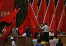 隨后,在激昂奮進的音樂聲中,校黨委副書記盧思鋒親自為各實踐分團授予2011年暑期社會實踐旗幟。13個實踐團代表揮舞著手中鮮艷的旗幟,現(xiàn)場一片熱烈激揚的氣氛,同學們使命感油然而生。