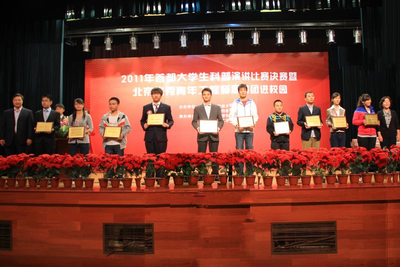北京市科協科普部姚儀鸞副部長和團市委大學部張賀鋒副部長為獲得優秀組織獎的學校頒獎;北京市科協何素興副主任和北京工商大學方德英副校長為優秀組織個人獎的獲獎單位頒發了榮譽證書;殷之光老先生和北京工商大學謝志華副校長為獲得本次比賽一等獎的10名演講者頒發了獎杯。
