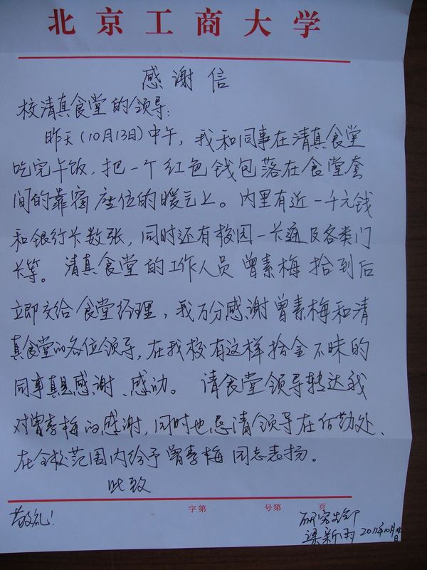 失主為學校食堂有這樣的好員工感到自豪,對后勤師傅的拾金不昧表示感謝,并專門寫來表揚信,懇請在全校范圍內給予表揚。