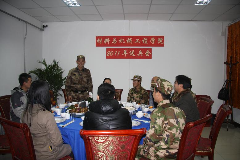 為了迎接老兵,歡送新兵入伍,材機(jī)學(xué)院于12月8日下午舉行了2011年材料與機(jī)械工程學(xué)院老兵復(fù)員、新兵入伍歡迎歡送會。學(xué)院黨總支書記呂東燕、黨總支副書記馬春暉,輔導(dǎo)員、入伍新兵及其班主任、退伍老兵、學(xué)生代表參加。