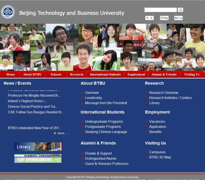 學校英文網站的建設追求三個特點,其一是設計要獨特。追求恢宏大氣,突出融融人氣,展現亮麗朝氣;其二是動靜結合。靜態力求全面,動態追求時效;其三是面向國際。按照國際慣例和要求,重點展示我校的學術成就和全貌。