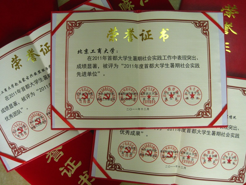 “北京工商大學赴內蒙古興安盟服務團”等12支實踐團隊獲評“2011年首都大學生暑期社會實踐優秀團隊”,《永安鎮農村家庭經濟狀況及基層民主建設情況的調研》等34份實踐成果獲評“2011年首都大學生暑期社會實踐優秀成果”,孫凱宣等10人獲評“2011年度首都大學生暑期社會實踐先進個人”,張秀芬等5人獲評“2011年度首都大學生暑期社會實踐先進工作者”。