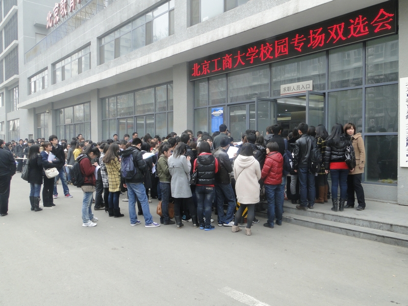 下午兩點,北京市大學生就業指導中心門口早已排起了長長的求職隊。本場雙選會是特別為由于各種原因沒能參加去年11月參加冬季雙選會的學生舉辦的,約計兩千余名左右畢業生參加。很多同學搭伴而來,面試間隙不忘隨時交流經驗;有些穿起了正裝,面試了一家緊接下一家,好不緊張;會場休息處,同學拿著就業指導中心提供的參會指南,一條一條地在參會單位名單上劃寫標記,修改簡歷,或練習介紹自己。