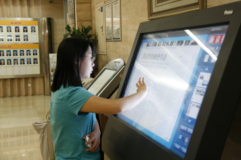 圖書館剛入門口的地方擺放了一臺電子讀報器,來自廣告設計09的劉寬正在聚精會神地“翻”看《新京報》。劉寬告訴記者,他只要有空過來就會來看看電子報,談道為什么會如此喜歡看新聞時他笑了笑說道,“不關心時事的廣告人,不是好的廣告人。”