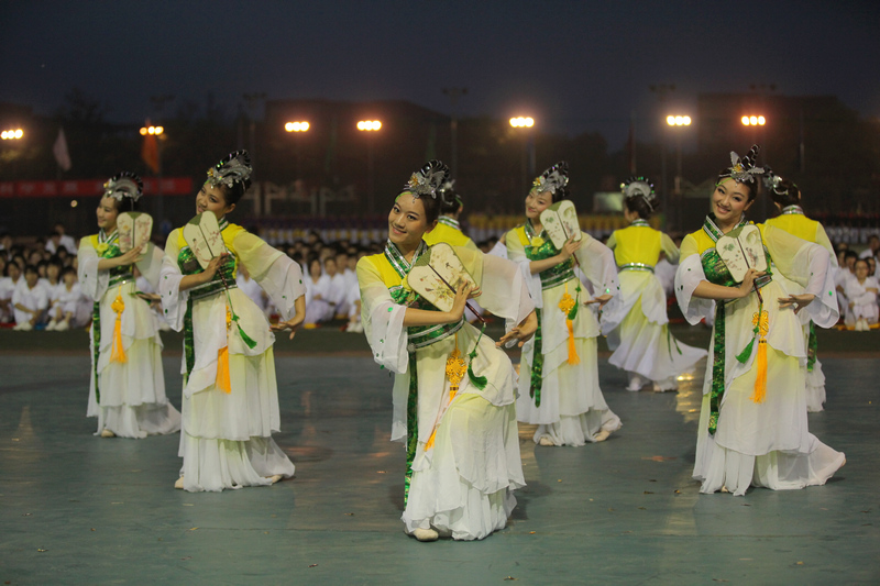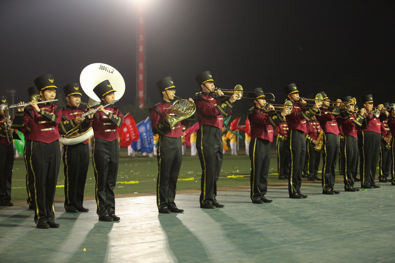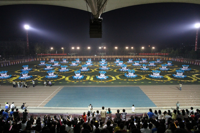 奏樂聲起,校管樂團演奏的《勇往直前進行曲》響徹全場,操場的中央,法學院的一百名學生身著黃色服裝,揮舞著各學院院旗和91個學生社團的旗幟,在燈光的照耀下,形成了一幅百旗飄揚的壯觀景象。