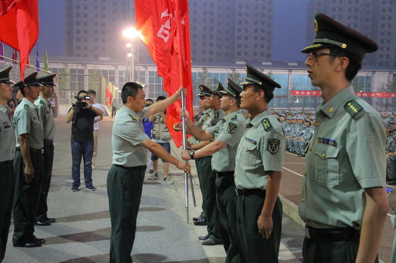 黨委書記孫堯東莊重地將團旗授予軍訓團團長王學東。王學東中校向各營營長授旗。
