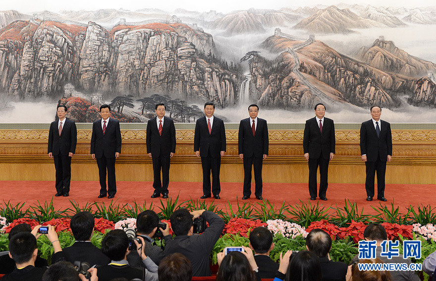 剛才,我們召開了中國共產黨第十八屆中央委員會第一次全體會議,會議上選舉產生了新一屆中央領導機構。全會選舉產生了七位中央政治局常委,選舉我擔任中共中央總書記。接下來,我把其他6位常委同事向大家介紹一下。