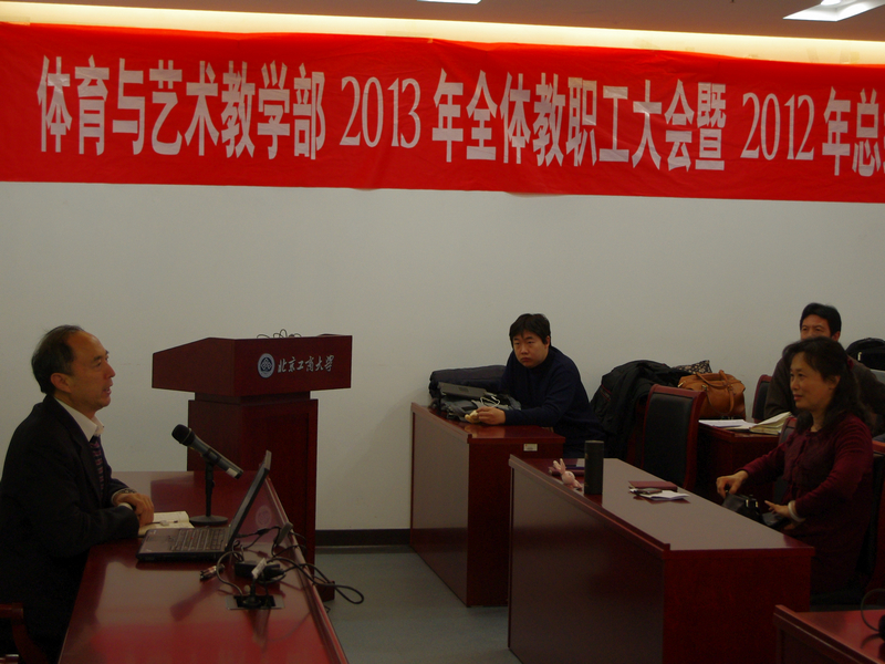 部主任顧紅以大事記的形式回顧了體育與藝術教學部2012年的工作情況,即各位教師積極參與、群策群力,在本科教學綜合改革、教學科研能力提升等方面取得可喜進步;創新工作方式,搭建有力平臺,促進了學科融合;群體活動及運動會、藝術團建設邁上新臺階,各項大型活動取得圓滿成功;藝術團首次走出國門,千人操震撼上演,元旦晚會異彩紛呈;分工會被評為“合格教職工之家”;游泳館各項工作逐漸走向正軌,等等。她指出,以上成績的取得,離不開全體教職員工的積極參與和共同努力。她對各位老師表示衷心的感謝,并希望在新的一年里,全體教職員工再接再厲,共同為部門和學校的發展做出貢獻。顧紅還對2013年的工作重點做了部署和通報。