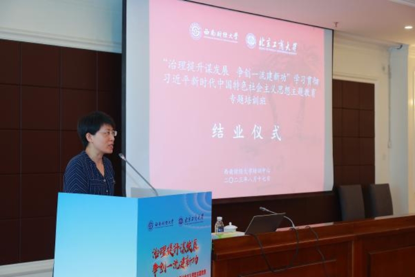 8月17日下午,培訓班進行各組匯報交流和結業儀式,經濟學院黨委書記呂素香主持,黨委副書記李中奇作總結講話。李中奇指出,此次培訓內容豐富、涉及面廣,采取主題講座、現場教學、互動研討等多種方式,有效幫助參訓學員們更新知識、開闊視野、創新理念,達到了堅定理想、錘煉黨性、開闊視野、指導實踐、推動工作的培訓效果。他以“熱情周到、干貨滿滿、學思踐悟”概括了本次培訓工作,西南財經大學用心用情、注重細節的工作態度讓全體參訓學員印象深刻;豐富的主題講座內容、生動的現場教學形式,讓學員們真正做到了學有所獲、學有所思、學有所得。最后,李中奇強調,本次培訓即將結束,學習貫徹習近平新時代中國特色社會主義思想主題教育是一個需要持續深化、不斷提升的過程,并對參訓學員提出三點要求:一要勇于承擔歷史使命。堅持從歷史發展的角度看待高等教育、看待學校事業發展、看待自身崗位職責,深入學習“干驚天動地事,做隱姓埋名人”的“兩彈一星”奉獻精神,弘揚追求真理、永攀高峰的科學精神,傳承老一輩科學家以身許國、心系人民的光榮傳統,樹立熱愛科學、崇尚科學的良好風尚。二要著力提升治理能力。通過此次培訓,要始終堅持以自我革命的精神破除制約學校高質量發展的思想積弊,為助推學校高質量發展提供制度引領和制度規范。三要注重改變工作作風。堅持講實干,不斷提高履職盡責能力和本領,把學到的新理念、新思路、新舉措內化于心、外化于行,以時時放心不下的責任感,扎實做好各項工作落實,勇挑責任重擔,強化底線意識,為推動學校各項事業高質量發展作出更大的貢獻。