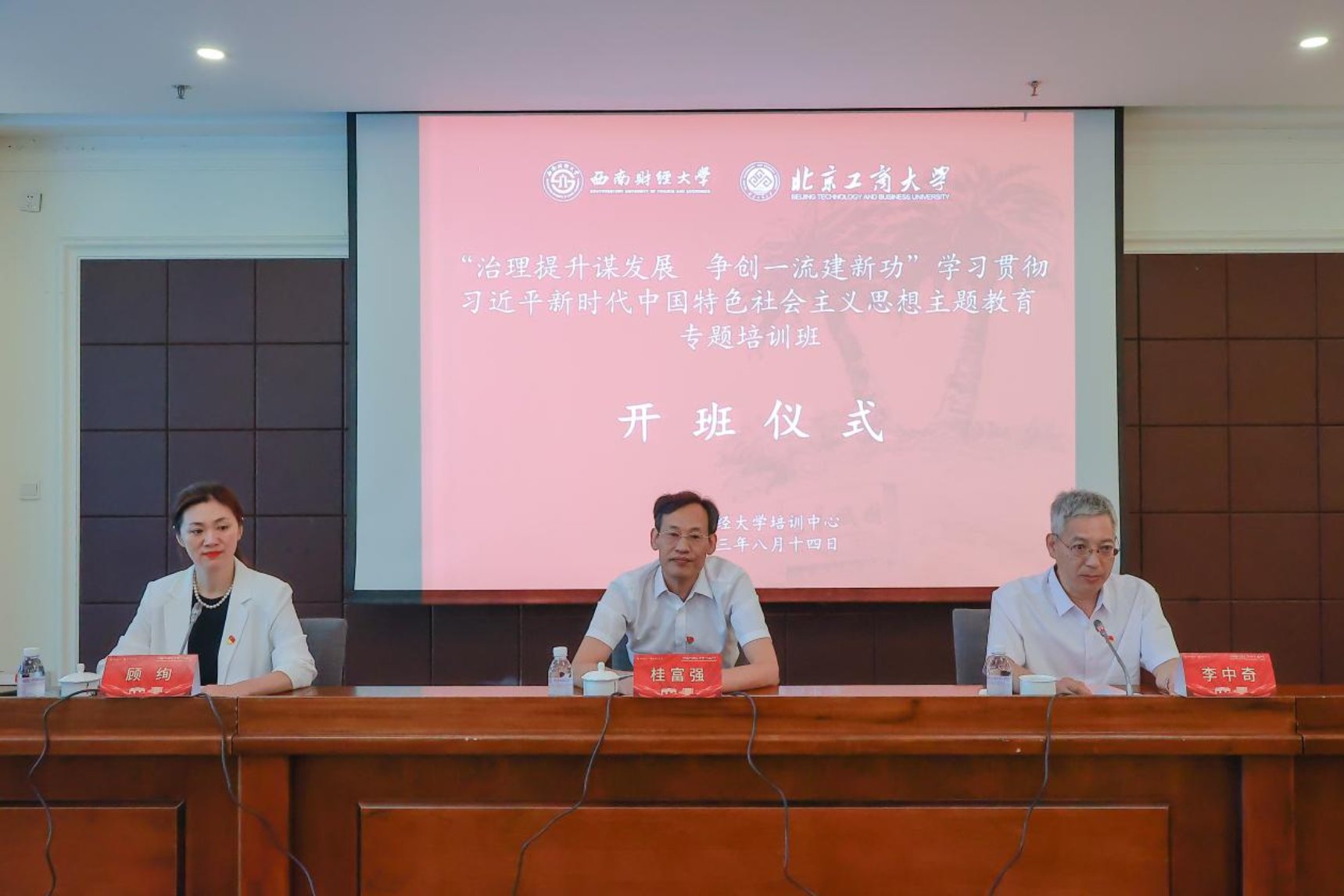 8月14日上午,專題培訓班舉行開班儀式。西南財經大學黨委常委、副校長桂富強致辭,對我校培訓班一行表示熱烈歡迎,介紹了西南財經大學的歷史沿革、基本概況與發展戰略,希望雙方以此次培訓交流為契機,進一步增強密切溝通、增進全面交流與深度合作。黨委副書記李中奇作動員講話,感謝西南財經大學周到細致的培訓安排,希望參訓學員們以此次培訓為契機,注重在系統學、持續學、學用結合上下更大功夫,全面掌握習近平新時代中國特色社會主義思想的精髓要義,不斷推動理論學習深化、內化、轉化。