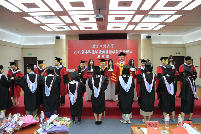 典禮在莊嚴的國歌聲中開始。學校教務處副處長孔凡航宣讀了《北京工商大學關于2013屆本科生畢業暨學士學位授予的決定》,團委書記呂良宣讀了表彰優秀畢業生的決定并為他們頒發證書。2013年法學院共有131人順利畢業,共有7人獲得北京市優秀畢業生榮譽稱號,7人獲得校優秀畢業生的榮譽稱號。