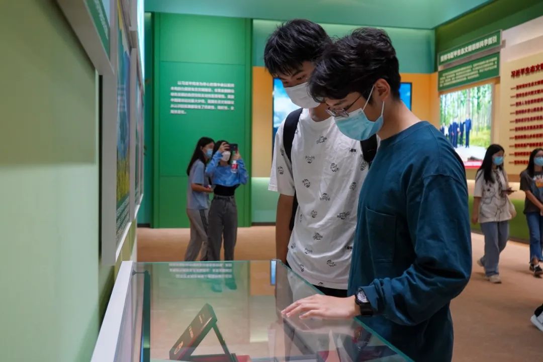 國慶70周年慶祝活動彩車微縮模型、數字中軸線沉浸式互動體驗、帶著高溫灼燒痕跡的神舟十二號返回艙、能夠縱覽大灣區地理風貌和重大地標性建筑的粵港澳大灣區沙盤……一件件精致的實物模型、一幅幅生動的照片、一個個翔實的數據圖表,吸引師生們頻頻駐足觀看并拍照留念。