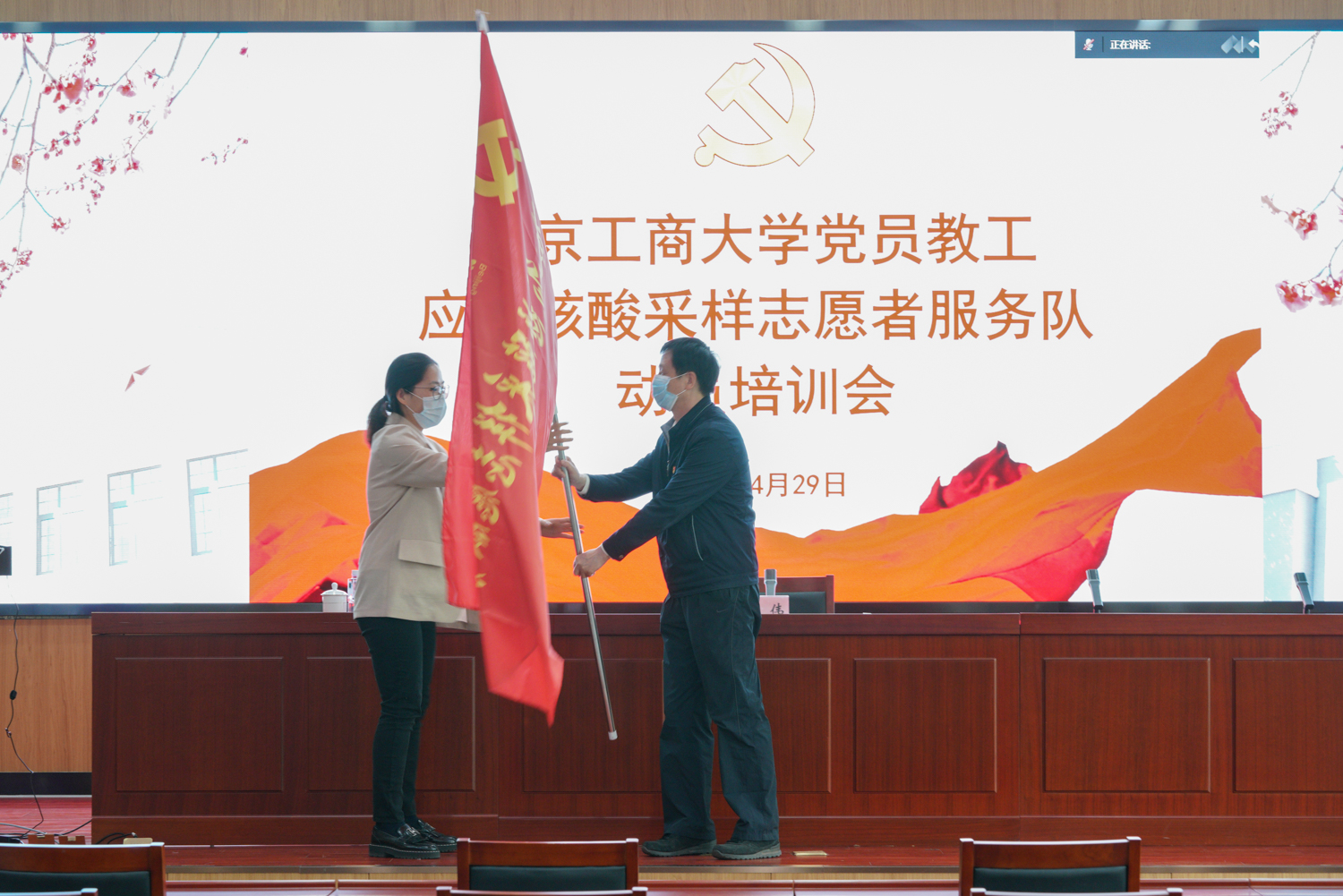 4月29日上午,學(xué)校以線下線上相結(jié)合的方式,召開(kāi)黨員教工應(yīng)急核酸采樣志愿服務(wù)隊(duì)動(dòng)員培訓(xùn)會(huì)。學(xué)校黨委副書(shū)記王偉出席會(huì)議,他肯定了黨員教工“抗疫有我、沖鋒在前”的精神品格,在關(guān)鍵時(shí)刻站得出來(lái)、頂?shù)蒙先ァ?qiáng)調(diào)要堅(jiān)持黨建引領(lǐng),貫徹落實(shí)上級(jí)各項(xiàng)工作部署,認(rèn)真參與培訓(xùn)、掌握專(zhuān)業(yè)要求、做好自我防護(hù),出色完成抗疫任務(wù),合力打贏抗疫阻擊戰(zhàn)。會(huì)上,王偉副書(shū)記為志愿者服務(wù)隊(duì)授旗。