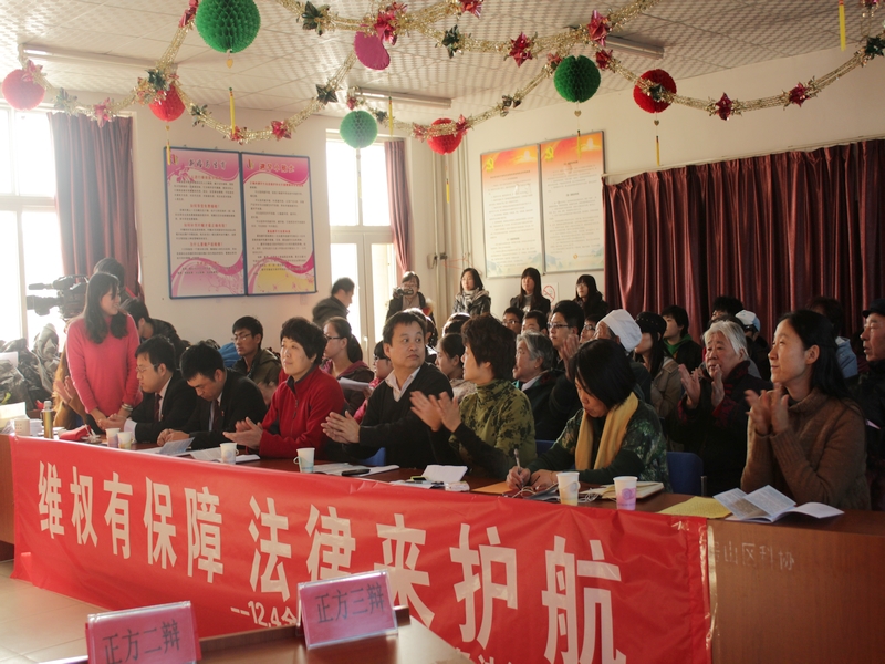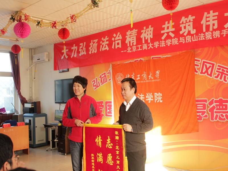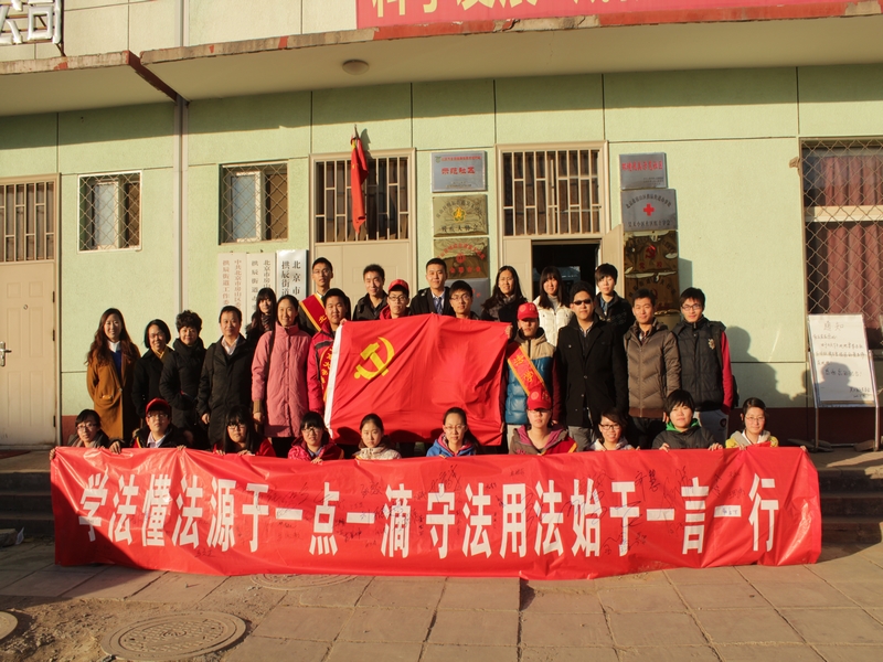 為了深入落實十八屆三中全會提出的建設法治中國的會議精神,迎接即將到來的12·4全國法制宣傳日,11月27日,法學院良鄉校區學生黨支部攜手房山區人民法院在良鄉昊天溫泉家園社區開展了以“大力弘揚法治精神,共筑偉大中國夢”為主題的社區普法黨日活動。法學院黨總支書記呂來明、黨總支副書記文四英、房山法院的六名法官、昊天溫泉家園社區領導出席活動,社區居民、學院部分教師、良鄉校區學生黨支部黨員及院青志協成員參加活動。房山電視臺對此次活動進行了報道。