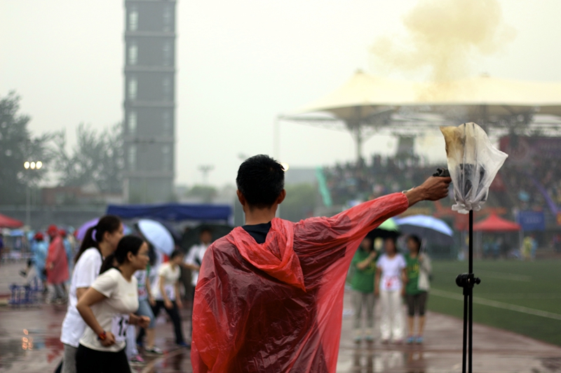 剛剛下過小雨的操場上地面還有些濕滑,跑道上依舊有許多積水。隨著一聲發令槍響,最考驗耐力的男子5000 米決賽開始了。