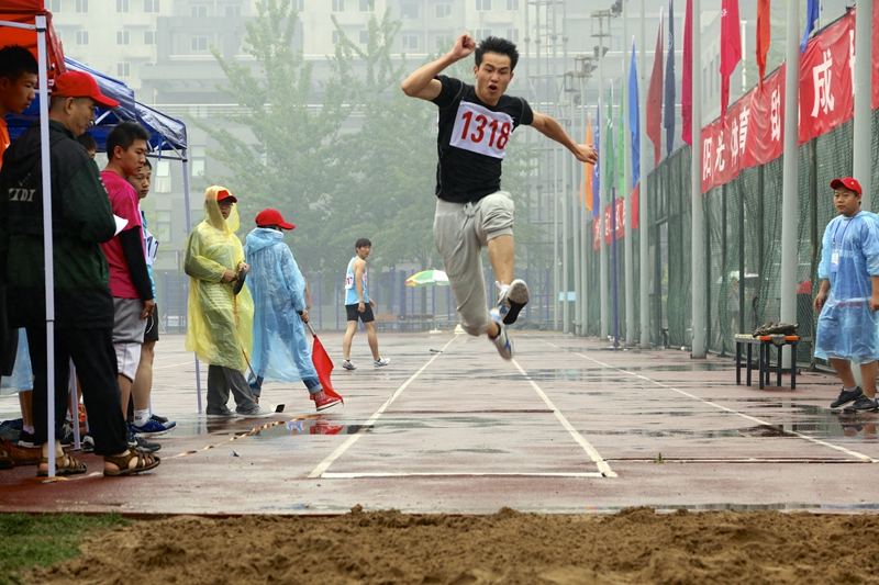 細雨綿綿,教師比賽的現場也同樣熱力四射。老年組的楊東杰老師結實的身體、飛揚的神采驚艷全場。在一段助跑后,他在起跳線單腳一蹬,矯健的身子便騰空而起,雙腳剛落地,周圍便響起一陣喝彩。這種超越年齡的實力得到了觀眾們的紛紛贊揚。“其實我平時也不經常練習跳遠,但一直堅持的長跑運動讓我有了一個好的身體素質。”同時,來自藝術與傳媒學院的姚悅老師作為女子青年組中的佼佼者,跳遠時動作輕盈,盡管在雨中,依舊努力的完成比賽。談到參加此次比賽的目的姚老師這樣說道:“我希望能為同學們做一個榜樣,用自己的行動,帶動他們多參加體育運動。”