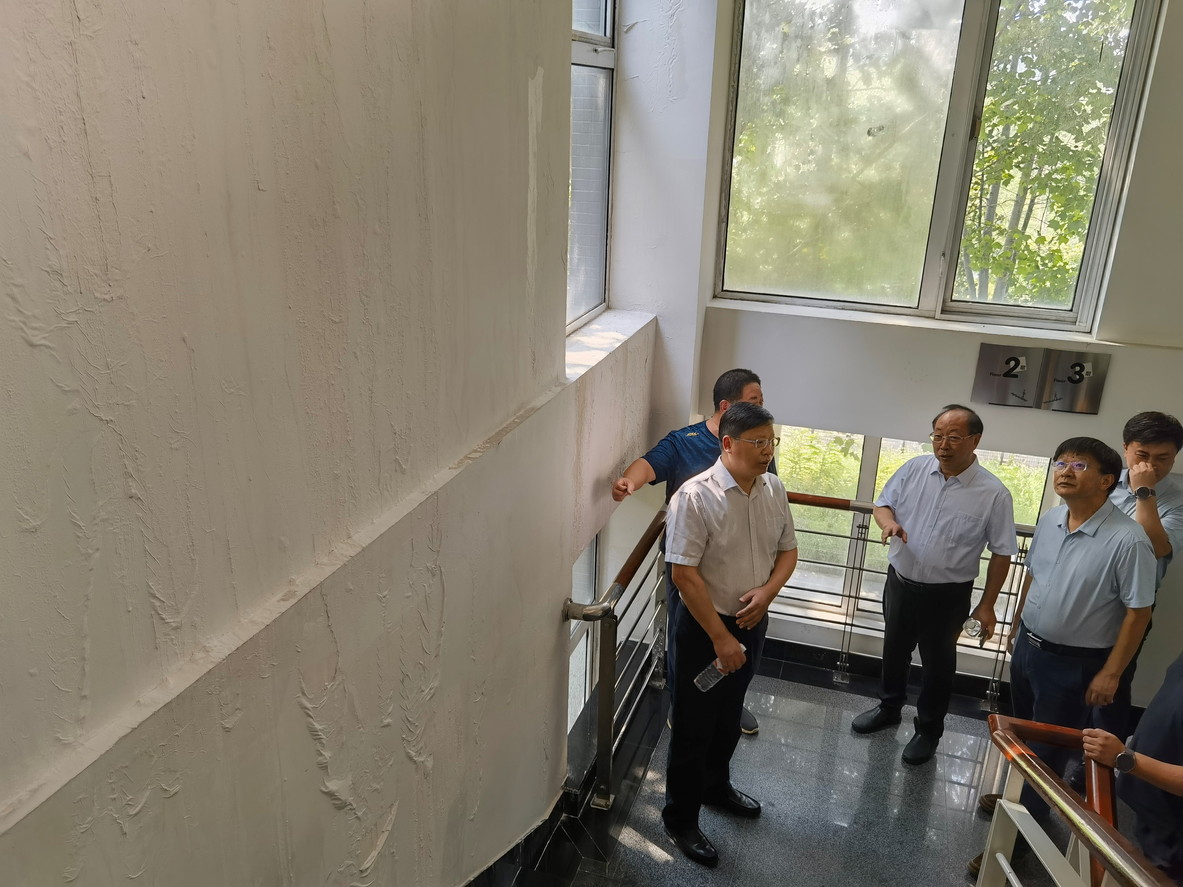 調研組一行實地查勘了西區食堂、學生活動中心、東區圖書館、藝術樓B座、文二樓等樓宇的受災情況。調研過程中,黃先開、郭建華匯報了學校受災情況,包括西區市政污水管線塌陷、西區食堂等處塌陷,東區圖書館、藝術樓B座等多個建筑樓頂漏雨、墻面滲水的情況。