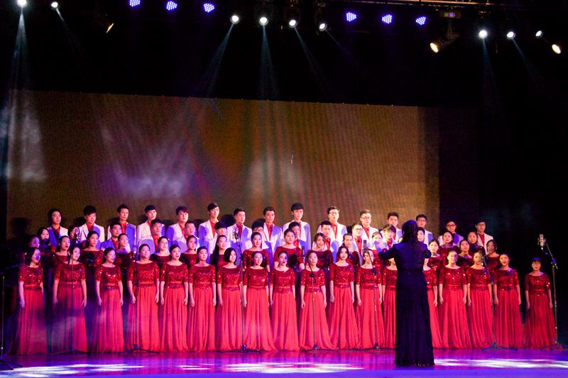 校合唱團為觀眾帶來了大合唱《時間都去哪兒了》,宛轉悠揚的歌聲勾起人們對時光的回憶與珍惜。歌者紅衣似火,淺唱歡快的旋律,一首《walk together children》以載歌載舞的形式點燃全場的氣氛。