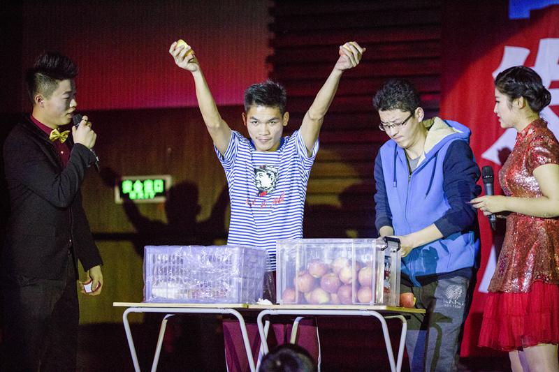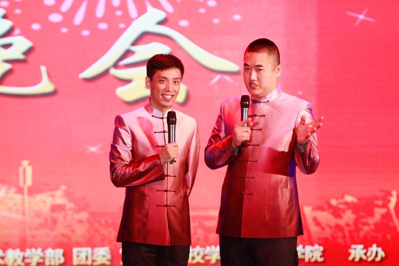 學校特邀青年相聲演員賈旭明、張康帶來表演《十全十美》,請現場觀眾出題,通過成語接龍的方式巧妙地將美好的“十全十美”送出,在歡聲笑語中帶給人們祝福。世界吉尼斯紀錄保持者閆百惠受邀為大家帶來了精妙的炫動呼啦圈表演。而來自校內的工商達人,用31個徒手掰蘋果的超高記錄給現場觀眾留下了深刻印象。